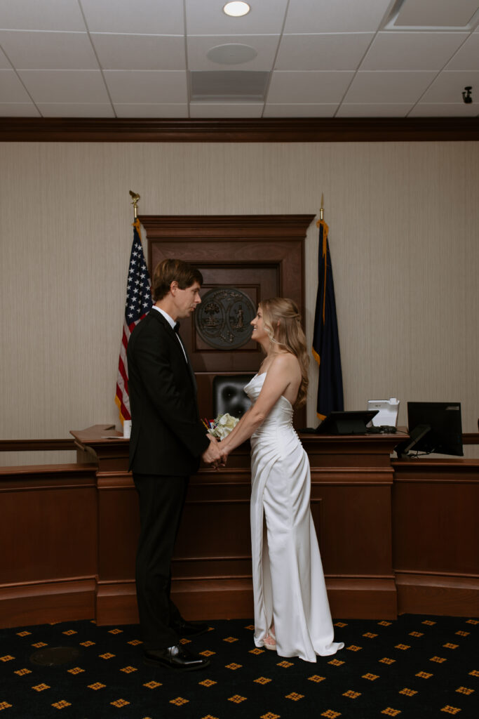 Brooke and Patrick chose to say their vows inside the new Spartanburg County Courthouse, a space defined by clean lines, soft natural light, and a modern simplicity that felt perfectly aligned with who they are.
